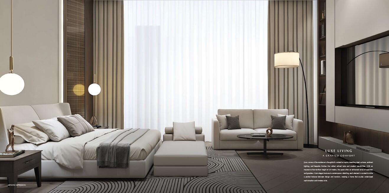 ENTRANCE LOBBY Walls/ Ceiling: Plastic emulsion paint False Ceiling: POP false ceiling Floors: Marble flooring/ laminated wooden floor Door: High quality wood/ engineered wood door frame with shutter finished in veneer/ laminate LIVING Walls/ Ceiling: Plastic emulsion paint False Ceiling: POP false ceiling Floors: Marble flooring/ laminated wooden floor Windows: UPVC/ aluminium double glass unit (DGU)/ door/ window with toughened glass KITCHEN Walls: 2'-0" high marble/ quartz/ tiles above counter/ plastic emulsion paint Ceilings: Plastic emulsion paint False Ceiling: POP false ceiling/ gypsum Floors: Marble flooring/ laminated wooden floor Counter: Granite/ quartz/ marble BEDROOM Walls: Plastic emulsion paint False Ceiling: POP false ceiling Floors: Marble flooring/ laminated wooden floor Door: High quality wood/ engineered wood door frame with shutter finished in veneer/ laminate Windows: UPVC/ aluminium double glass unit (DGU)/ door/ window with toughened glass TOILET Walls: Marble dado Ceiling: Plastic emulsion paint False Ceiling: POP false ceiling Floors: Marble flooring Door: High quality wood/ engineered wood door frame with shutter finished in veneer/ laminate Others: Vanity with counter CP and sanitary fittings of brands like Jaquar/ Kohler/ or equivalent BALCONY Walls: Exterior paint/ glazing/ cladding as per elevation Ceiling: Oil bound distemper Floors: Anti skid vitrified tiles/ ceramic/ porcelain Others: Glass/ MS railing/ any other as per building elevation OTHER SPECIFICATIONS ELECTRICAL: Modular switches & sockets, copper wiring AIR CONDITIONING SYSTEM: Air conditioning units of adequate capacities SECURITY: Multi-tier security system i/c CCTV brands like Panasonic/ Honeywell/ Hikvision/ CP Plus in Lift Lobby & Corridors DOOR HARDWARE: Premium locks with handles ELEVATORS: High-speed elevators of brands like Mitsubishi/ Fujitec/ Hitachi/ Schindler/ or equivalent