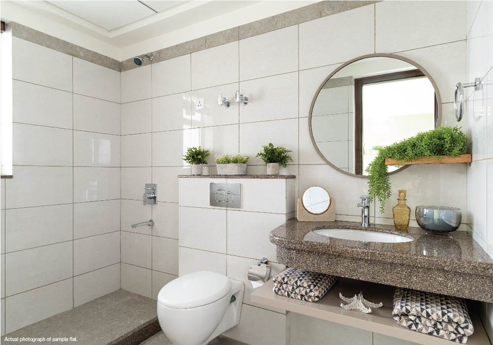 AIR PURIFICATION SYSTEM Centrally Treated Fresh Air System (CTFA Technology) runs through the entire home, purifies air, removes stale air, controls carbon dioxide, eliminates harmful germs up to PM 2.5, traps harmful bacteria; involves Outdoor Fresh Air Duct, Air Exhaust, Ducts, Indoor Air Inlet, central purification unit, Interior Outlet. BATHROOMS Low-flow water efficient fixtures. KITCHEN Low-flow water efficient fixtures. WATER TREATMENT SYSTEM Central Water Softening Plant provides soft water, preserves life of water appliances (heaters, laundry equipment), saves energy costs. HOME AUTOMATION Smart Home app control for Light, Fan, AC, TV.