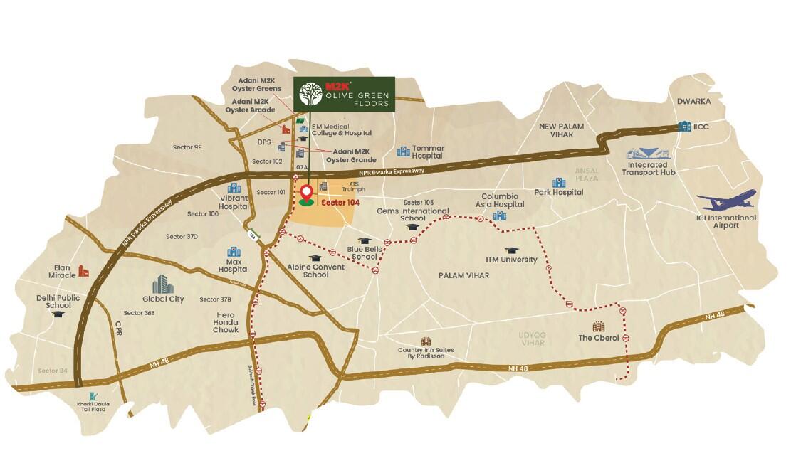 - Some popular transit points closest to M2K Olive Green Floors Sector 104, Gurgaon are Basai dhankot railway station and Gurgaon railway station. Out of this, Basai dhankot railway station is the nearest from this location.